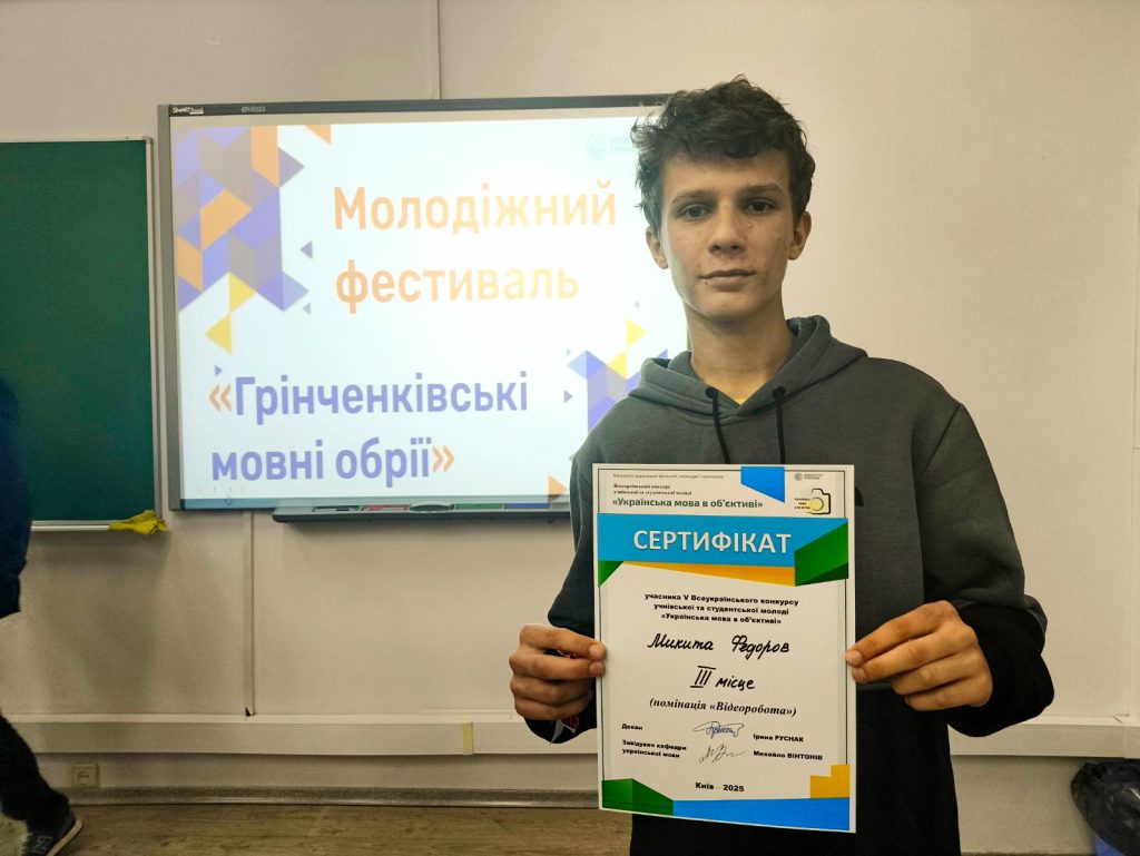 Микита отримав нагороду за відеороботу на тему «Українська мова і молодь: створюємо майбутнє разом», присвячену маловідомим і діалектним українським словам. Його творча робота демонструє любов до рідної мови, креативність і щире прагнення зберігати мовні традиції нашого народу.