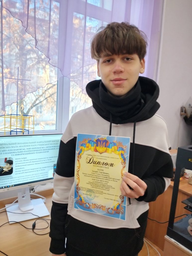 Вітаємо вихованців Центру технічної творчості молоді Дарницького району Батіна Андрія (гурток «Основи WEB-дизайну) за зайняте II місце та Шевцова Артема (гурток «Програмування») – III місце в I (районному) етапі Всеукраїнського конкурсу-захисту науково-дослідницьких робіт учнів-членів Малої академії наук України у 2025/2026 навчальному році.